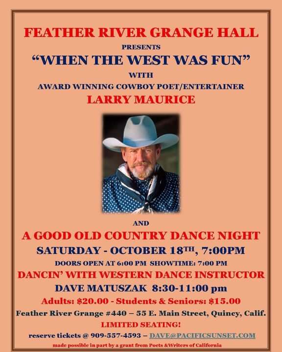 Join us for an unforgettable evening at Feather River Grange Hall with the event “When the West Was Fun,” featuring award-winning cowboy poet and entertainer Larry Maurice. Known for his captivating poetry, storytelling, and deep knowledge of western history, Larry brings a touch of the Old West to life, with accolades including a nomination for the Will Rogers Award for Best Male Cowboy Poet. The night continues with a lively good old country dance session led by local Western dance instructor Dave Matuszak, offering lessons and dancing from 8:30 PM to 11:00 PM. Scheduled for Saturday, October 18th at 7:00 PM (doors open at 6:00 PM)